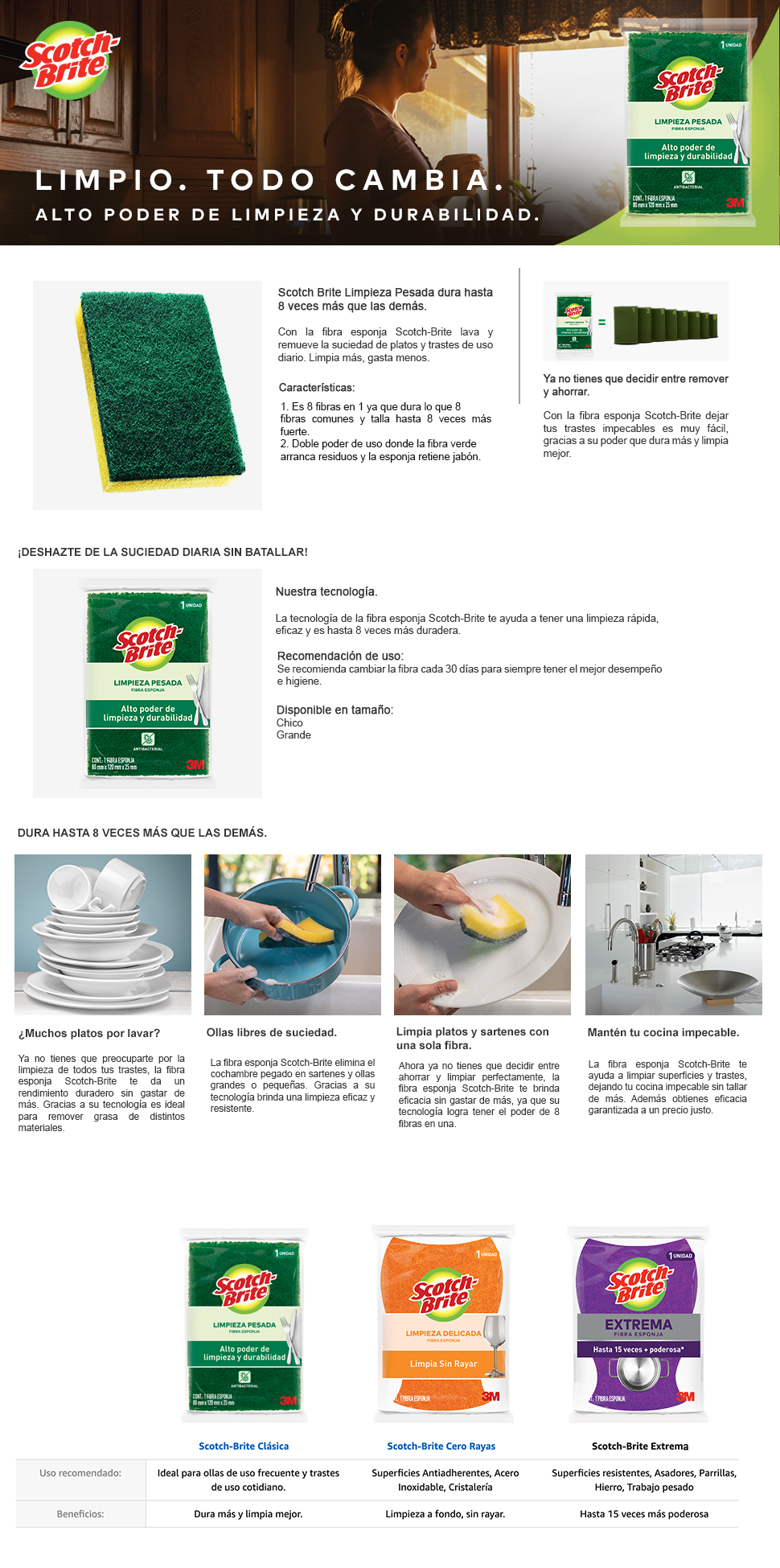 Con la fibra esponja Scotch-Brite® lava y remueve la suciedad de platos y trastes de uso diario. Ideal para utensilios de cocina sin recubrimientos antiadherentes, ollas, sartenes, rejillas y otras superficies que no sean susceptibles al rayado.